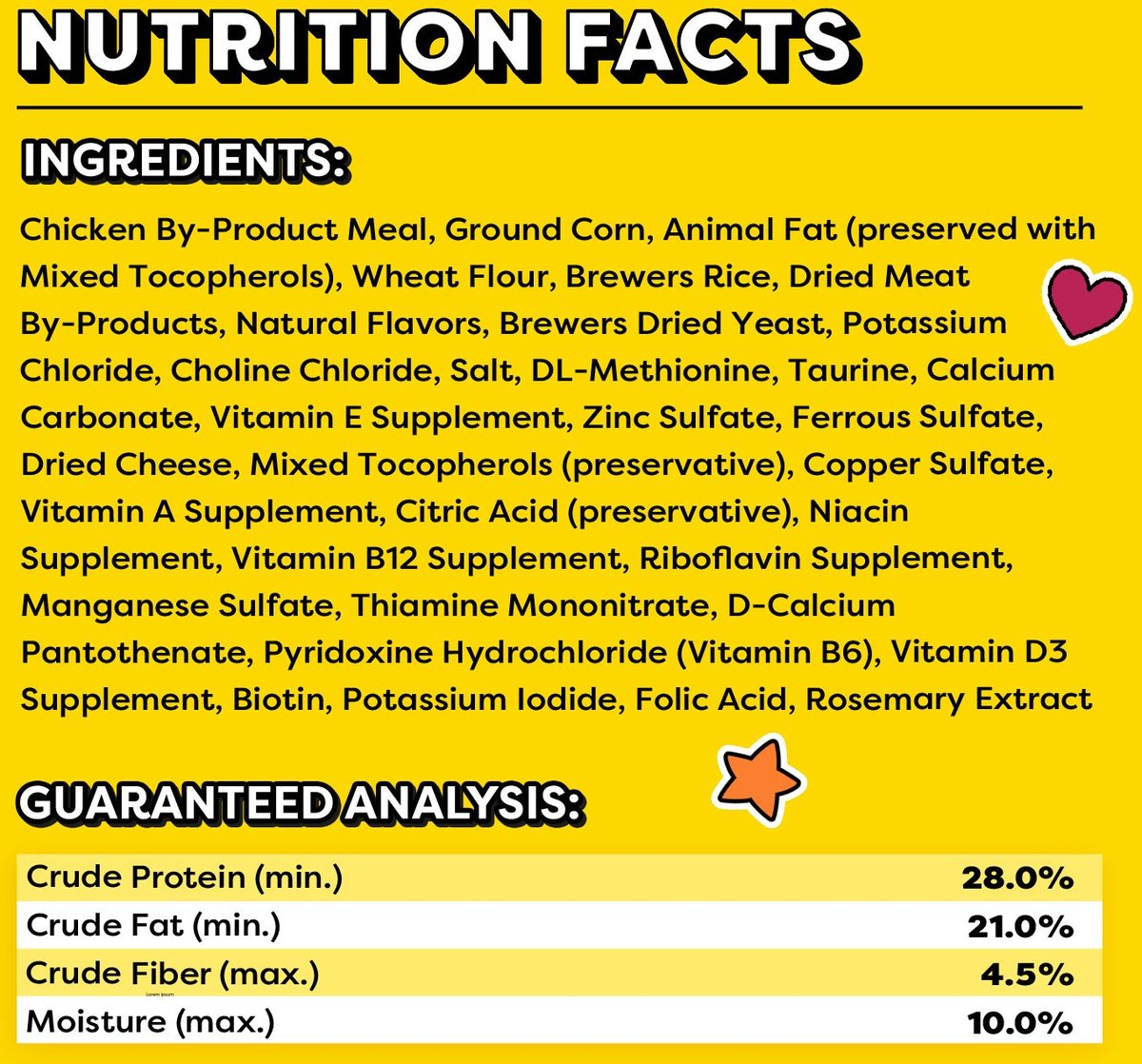 Chicken By-Product Meal, Ground Corn, Animal Fat (preserved with Mixed Tocopherols), Brewers Rice, Wheat Flour, Dried Meat By-Products, Natural Flavors, Brewers Dried Yeast, Potassium Chloride, Choline Chloride, Salt, Taurine, DL-Methionine, Calcium Carbonate, DL-Alpha Tocopherol Acetate (source of Vitamin E), Zinc Sulfate, Mixed Tocopherols (preservative), Dried Cheese, Copper Sulfate, Vitamin A Acetate, Niacin Supplement, Vitamin B12 Supplement, Riboflavin Supplement, Manganese Sulfate, Thiamine Mononitrate, D-Calcium Pantothenate, Biotin, Vitamin D3 Supplement, Potassium Iodide, Pyridoxine Hydrochloride (Vitamin B6), Folic Acid.